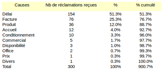 Le responsable Qualité veut faire le point sur les réclamations clients reçues pendant une période T, pour en connaitre les causes, dans le but d’améliorer le niveau de satisfaction du client final.