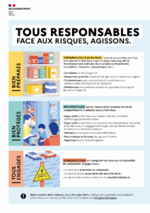 - Risques naturels (inondations, incendies, séismes…) : il faut principalement rester à l’abri, éviter les déplacements, suivre les consignes officielles…